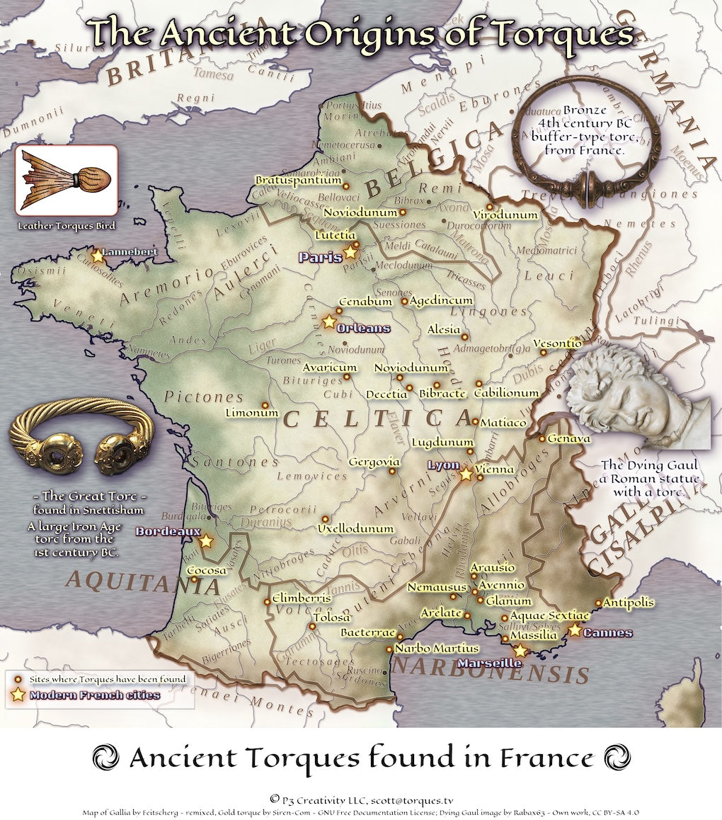 Torques were popular with Celts, Vikings, Romans, and Greeks from around the 8th century BC to the 3rd century AD and symbolized bravery, esteem, and royal authority. We have reinvented the ancient game of Torques into a Toss Game and Racquet Sport along with Mind Health Tools promoting self esteem development. Here's a Map of Ancient Torques found in France.